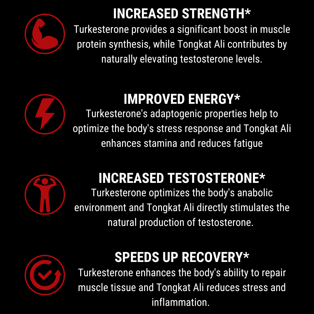 Turkesterone enhances the body's ability to repair muscle tissue and Tongkat Ali reduces stress and inflammation. This synergistic effect not only speeds up recovery times but also minimizes muscle soreness.
